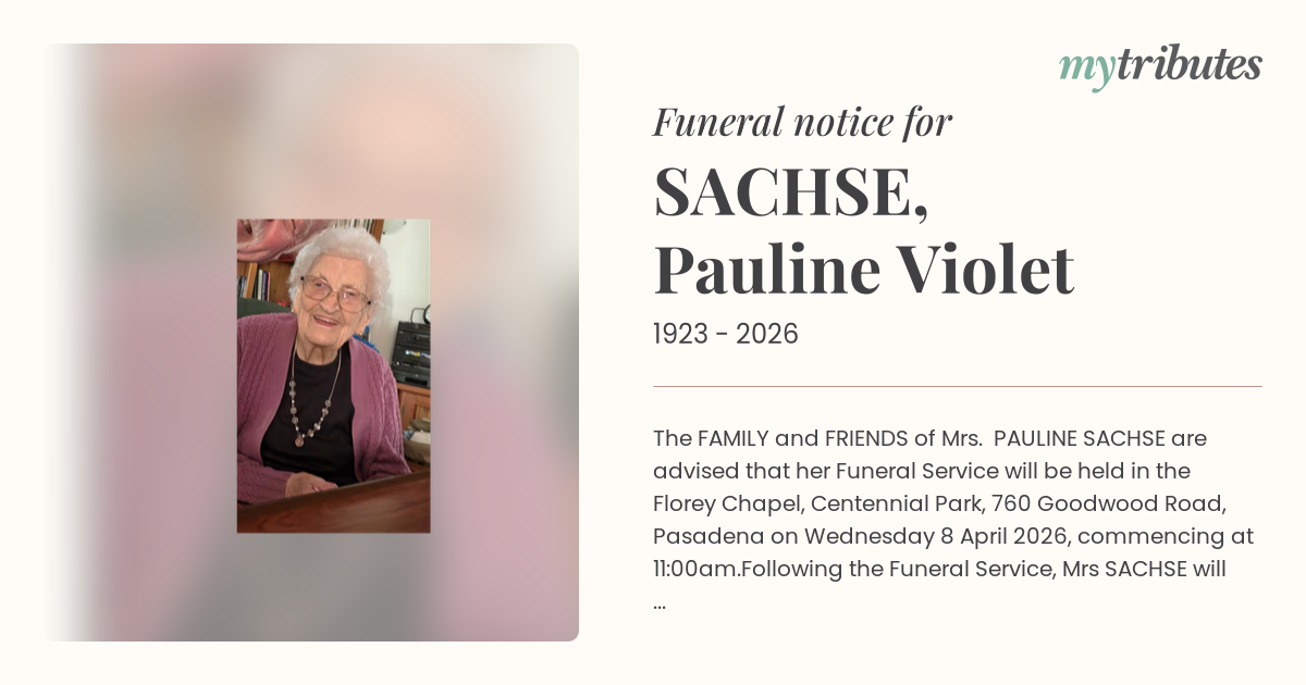 19°CThe FAMILY and FRIENDS of Mrs. PAULINE SACHSE are advised that her Funeral Service will be held in the Florey Chapel, Centennial Park, 760 Goodwood Road, Pasadena on Wednesday 8 April 2026, commencing at 11:00am.