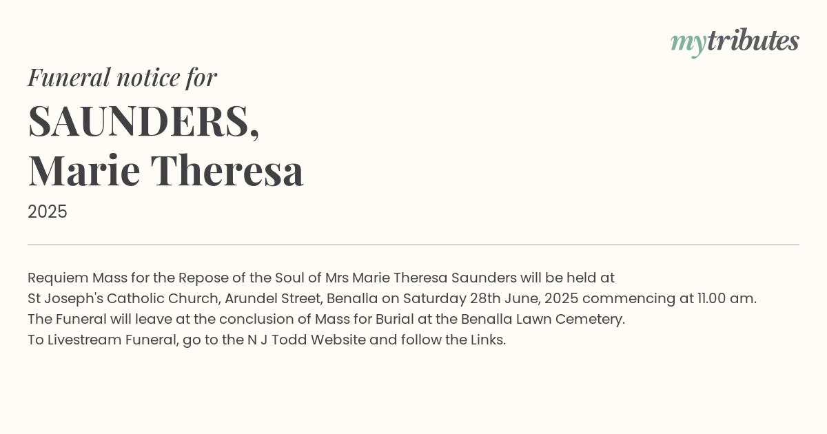 19°CRequiem Mass for the Repose of the Soul of Mrs Marie Theresa Saunders will be held at