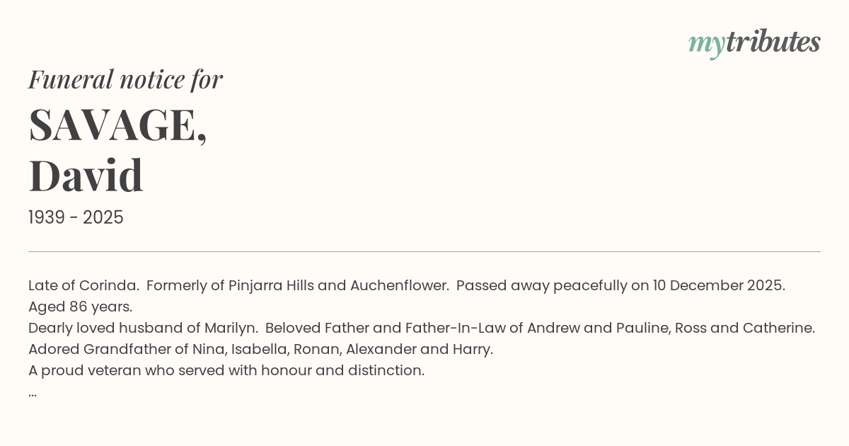Family and friends are invited to attend David’s service to be held at St David’s Anglican Church, 62 Chelmer Street East, Chelmer, on Thursday 18 December 2025 at 10:30am.