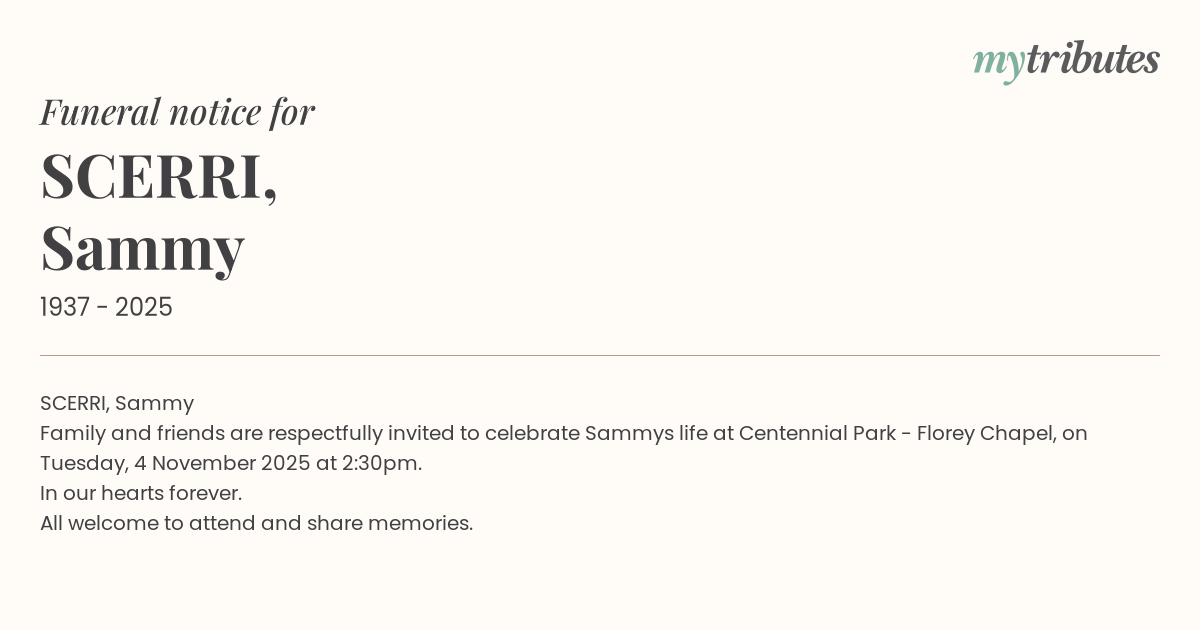 Family and friends are respectfully invited to celebrate Sammy’s life at Centennial Park - Florey Chapel, on Tuesday, 4 November 2025 at 2:30pm.