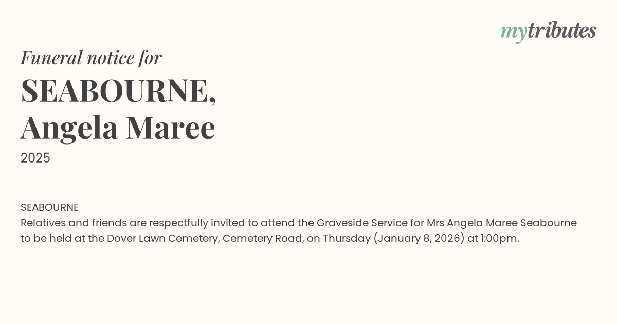 Relatives and friends are respectfully invited to attend the Graveside Service for Mrs Angela Maree Seabourne to be held at the Dover Lawn Cemetery, Cemetery Road, on Thursday (January 8, 2026) at 1:00pm.