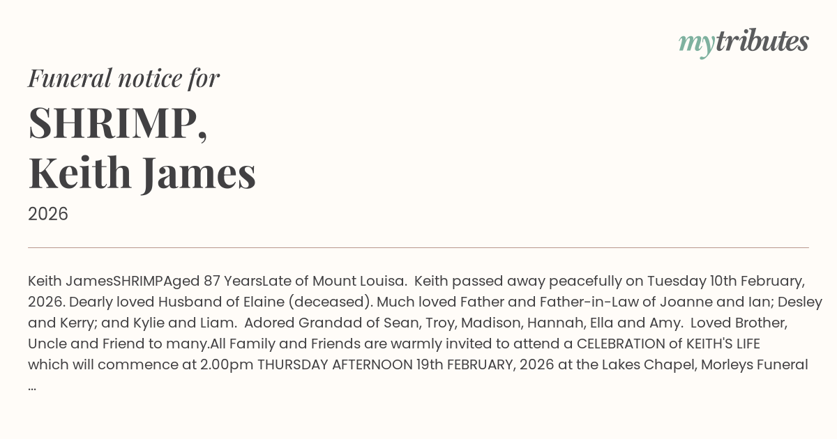 Late of Mount Louisa. Keith passed away peacefully on Tuesday 10th February, 2026. Dearly loved Husband of Elaine (deceased). Much loved Father and Father-in-Law of Joanne and Ian; Desley and Kerry; and Kylie and Liam. Adored Grandad of Sean, Troy, Madison, Hannah, Ella and Amy. Loved Brother, Uncle and Friend to many.
