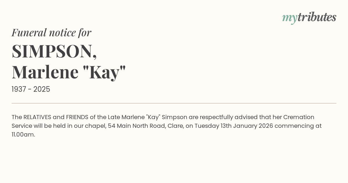 19°CThe RELATIVES and FRIENDS of the Late Marlene "Kay" Simpson are respectfully advised that her Cremation Service will be held in our chapel, 54 Main North Road, Clare, on Tuesday 13th January 2026 commencing at 11.00am.