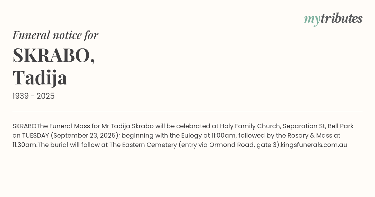 The Funeral Mass for Mr Tadija Skrabo will be celebrated at Holy Family Church, Separation St, Bell Park on TUESDAY (September 23, 2025); beginning with the Eulogy at 11:00am, followed by the Rosary & Mass at 11.30am.