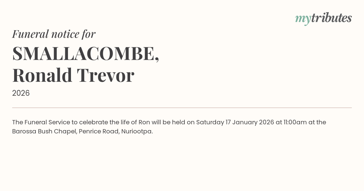 19°CThe Funeral Service to celebrate the life of Ron will be held on Saturday 17 January 2026 at 11:00am at the Barossa Bush Chapel, Penrice Road, Nuriootpa.