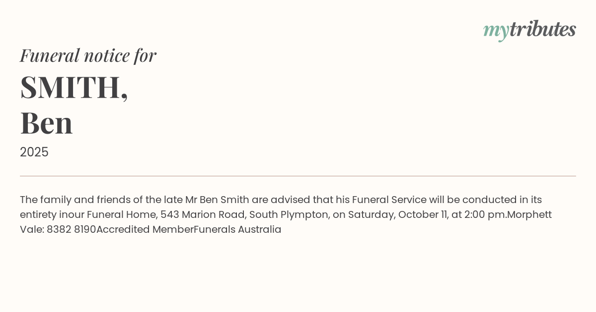 19°CThe family and friends of the late Mr Ben Smith are advised that his Funeral Service will be conducted in its entirety in