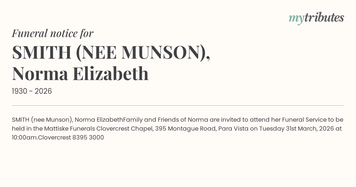 Family and Friends of Norma are invited to attend her Funeral Service to be held in the Mattiske Funerals Clovercrest Chapel, 395 Montague Road, Para Vista on Tuesday 31st March, 2026 at 10:00am.