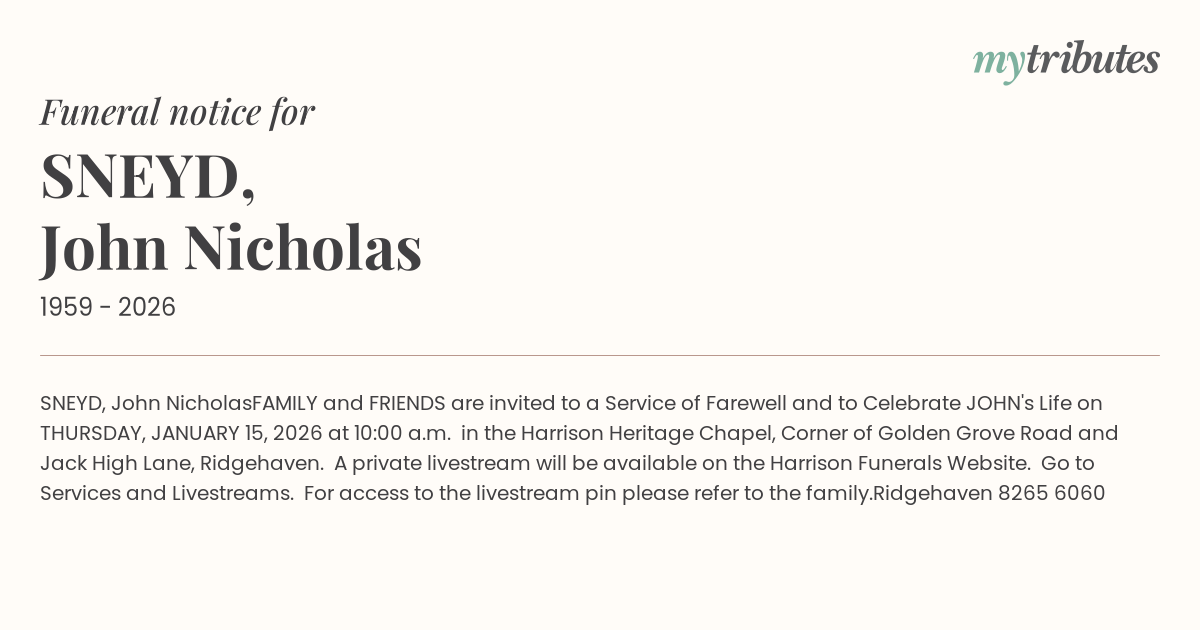 FAMILY and FRIENDS are invited to a Service of Farewell and to Celebrate JOHN's Life on THURSDAY, JANUARY 15, 2026 at 10:00 a.m. in the Harrison Heritage Chapel, Corner of Golden Grove Road and Jack High Lane, Ridgehaven.