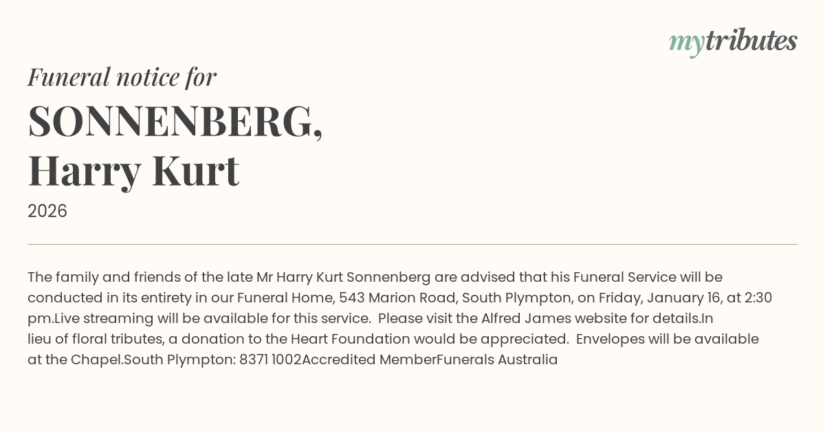 19°CThe family and friends of the late Mr Harry Kurt Sonnenberg are advised that his Funeral Service will be conducted in its entirety in our Funeral Home, 543 Marion Road, South Plympton, on Friday, January 16, at 2:30 pm.