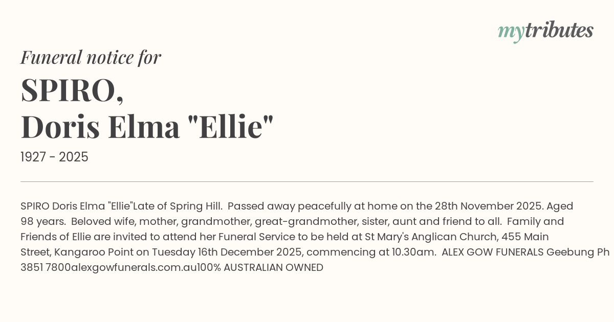 Family and Friends of Ellie are invited to attend her Funeral Service to be held at St Mary's Anglican Church, 455 Main Street,