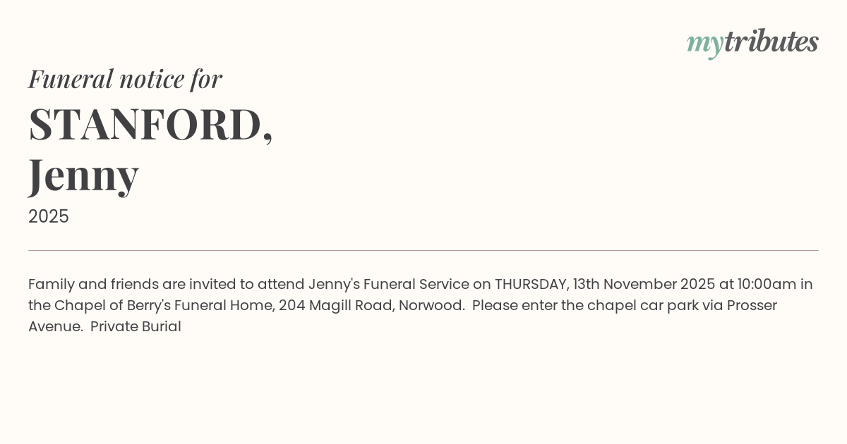 19°CFamily and friends are invited to attend Jenny's Funeral Service on THURSDAY, 13th November 2025 at 10:00am in the