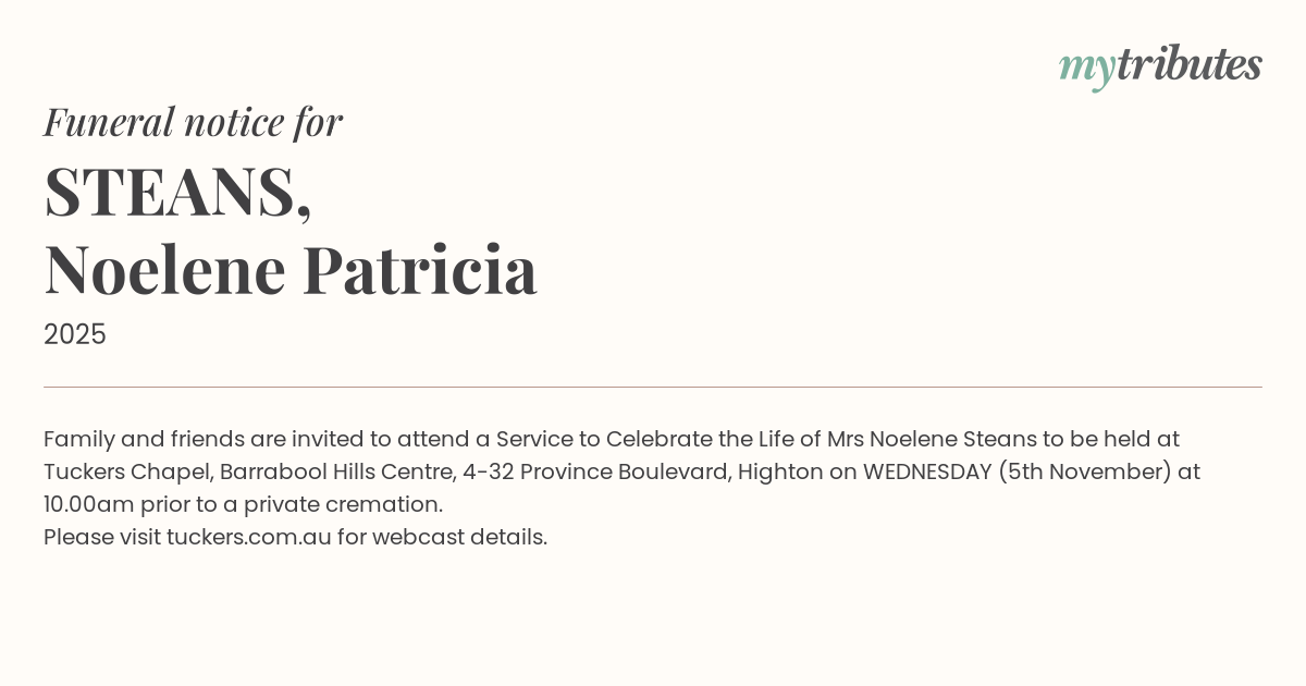 19°CFamily and friends are invited to attend a Service to Celebrate the Life of Mrs Noelene Steans to be held at Tuckers Chapel, Barrabool Hills Centre, 4-32 Province Boulevard, Highton on WEDNESDAY (5th November) at 10.00am prior to a private cremation.