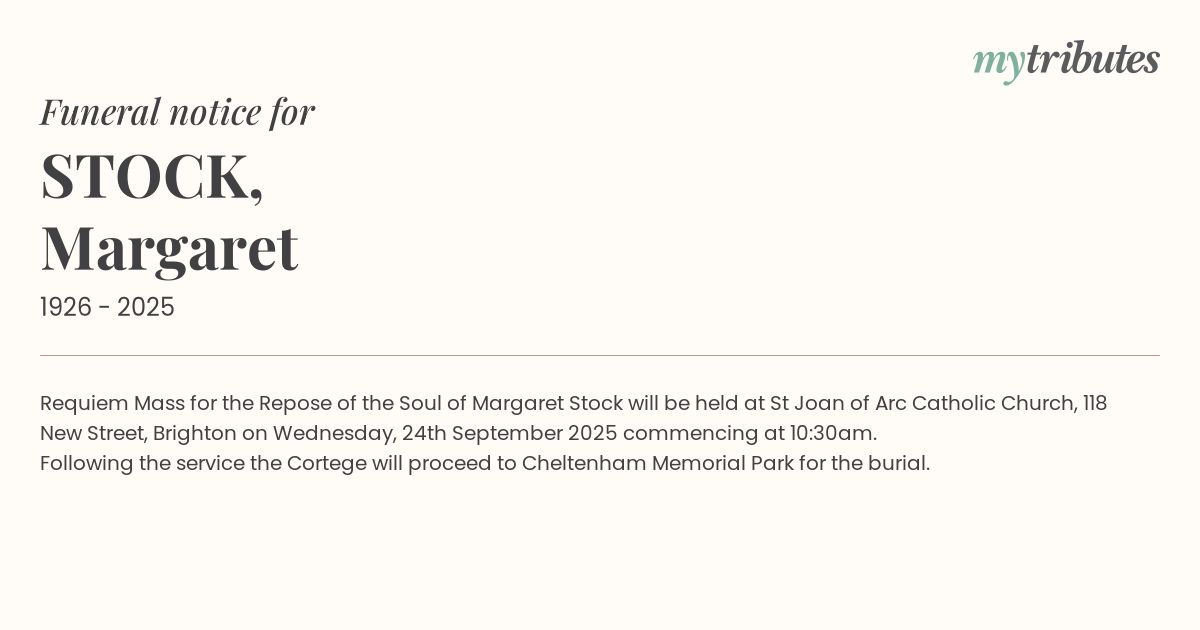19°CRequiem Mass for the Repose of the Soul of Margaret Stock will be held at St Joan of Arc Catholic Church, 118 New Street, Brighton on Wednesday, 24th September 2025 commencing at 10:30am.