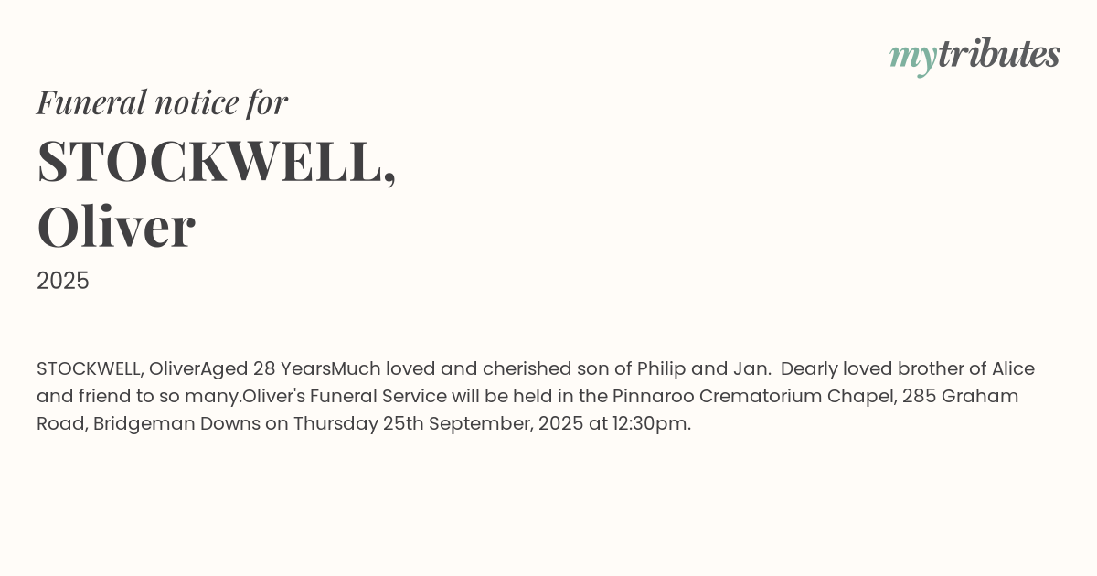 Oliver's Funeral Service will be held in the Pinnaroo Crematorium Chapel, 285 Graham Road, Bridgeman Downs on Thursday