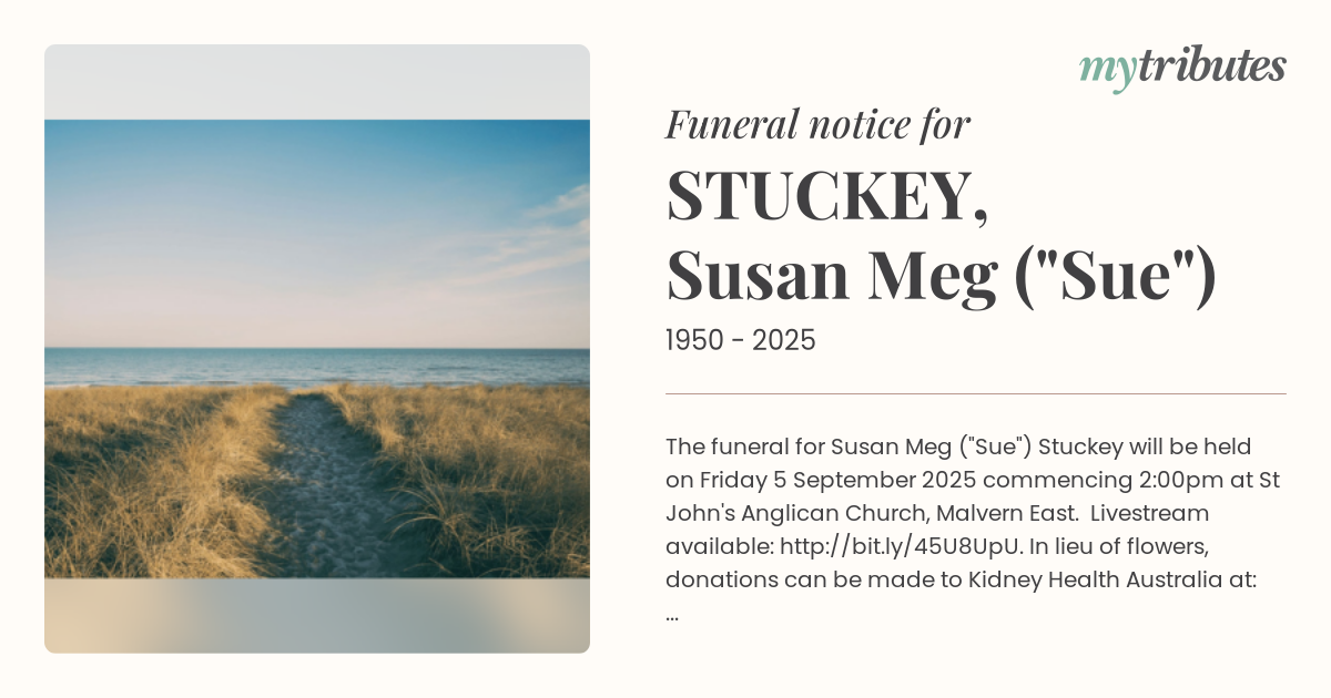 19°CThe funeral for Susan Meg ("Sue") Stuckey will be held on Friday 5 September 2025 commencing 2:00pm at St John's Anglican Church, Malvern East. Livestream available: http://bit.ly/45U8UpU . In lieu of flowers, donations can be made to Kidney Health Australia at: https://www.kidney.org.au
