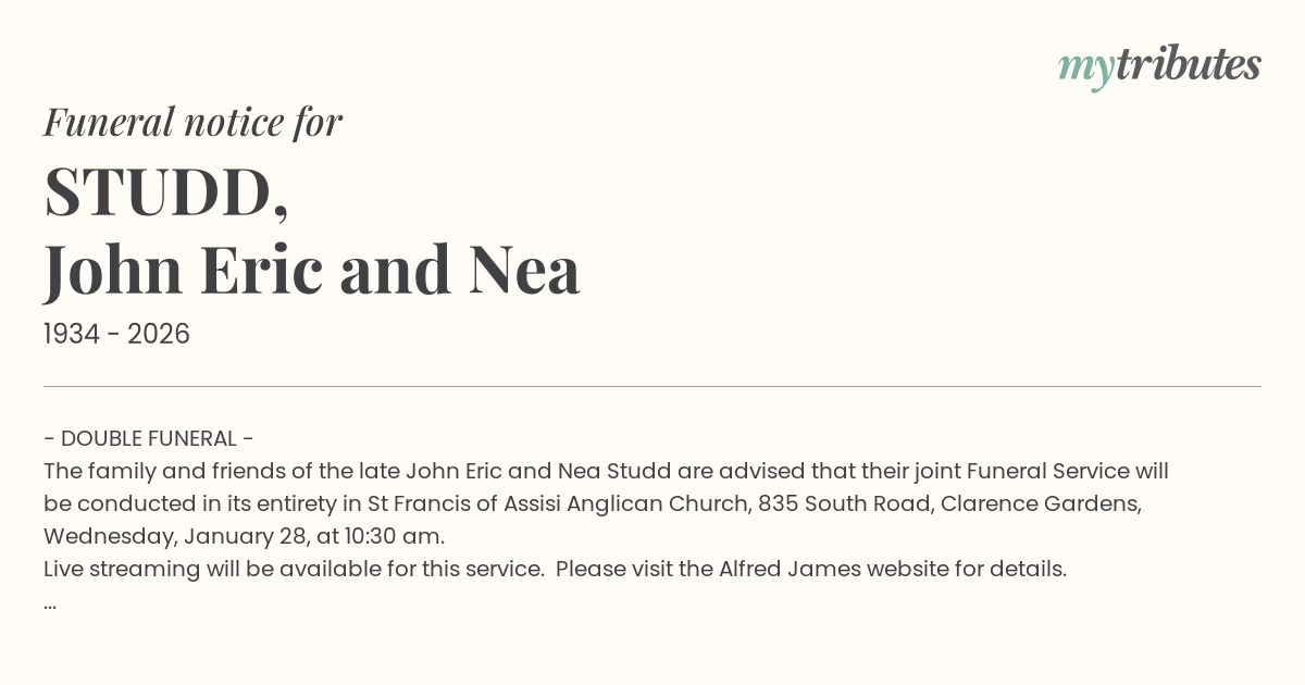 The family and friends of the late John Eric and Nea Studd are advised that their joint Funeral Service will be conducted in its entirety in St Francis of Assisi Anglican Church, 835 South Road, Clarence Gardens, Wednesday, January 28, at 10:30 am.