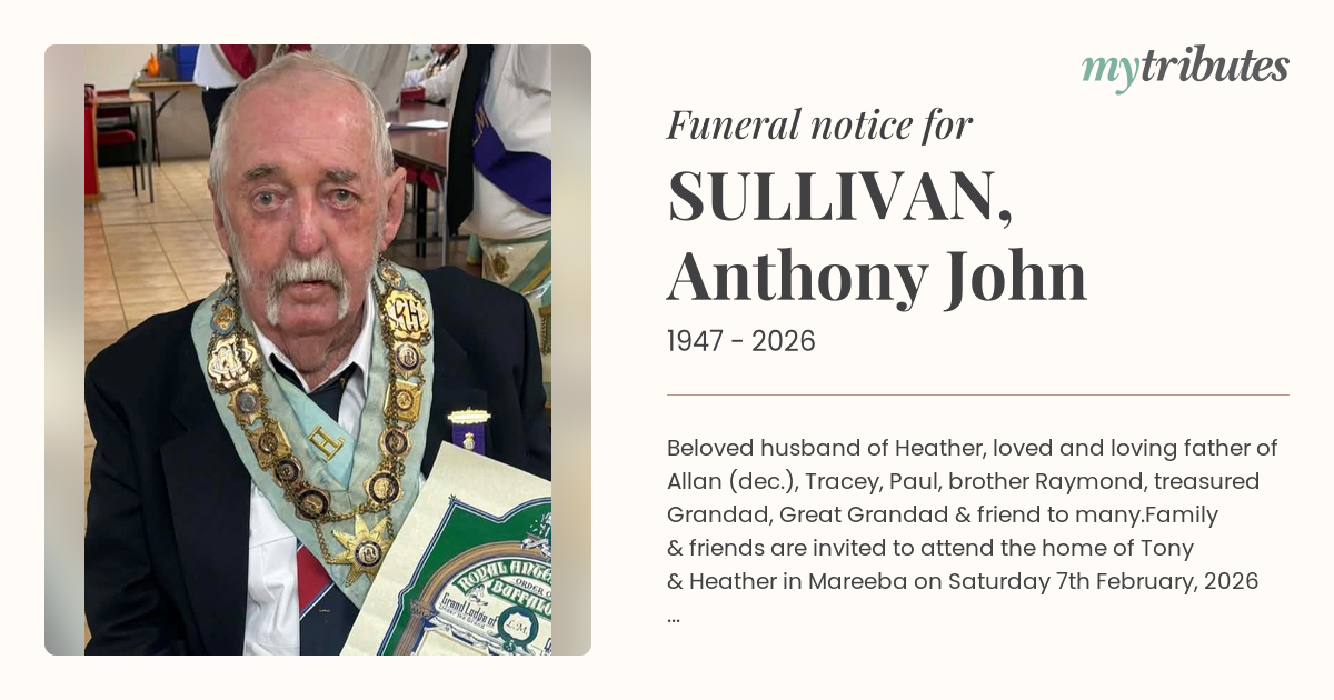 Family & friends are invited to attend the home of Tony & Heather in Mareeba on Saturday 7th February, 2026 at 1pm to celebrate his life.