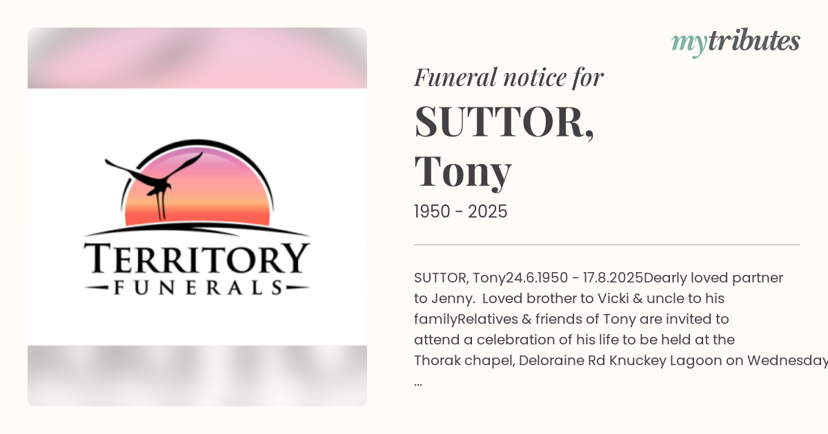 For those unable to attend, Tony's service will be live streamed via the Territory Funerals website
