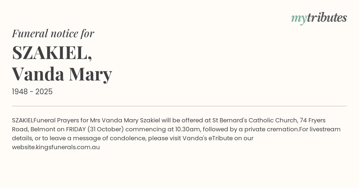 For livestream details, or to leave a message of condolence, please visit Vanda's eTribute on our website.