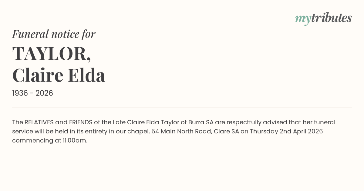 19°CThe RELATIVES and FRIENDS of the Late Claire Elda Taylor of Burra SA are respectfully advised that her funeral service will be held in its entirety in our chapel, 54 Main North Road, Clare SA on Thursday 2nd April 2026 commencing at 11.00am.