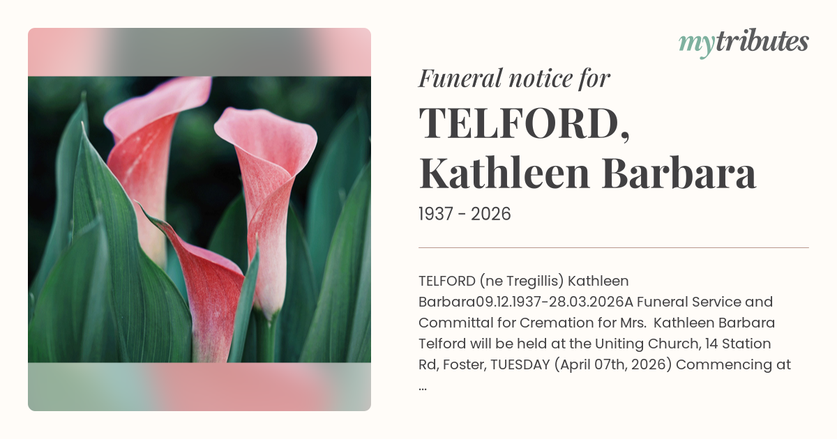 A Funeral Service and Committal for Cremation for Mrs. Kathleen Barbara Telford will be held at the Uniting Church, 14 Station Rd, Foster, TUESDAY (April 07th, 2026) Commencing at 1:30pm.