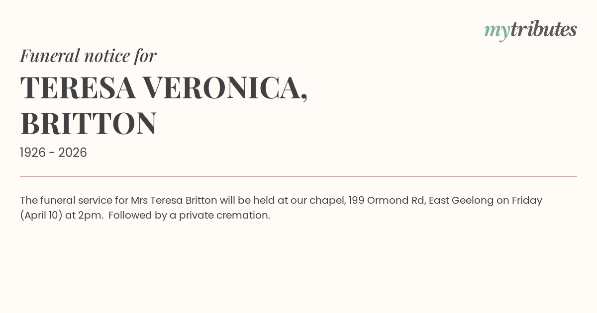 19°CThe funeral service for Mrs Teresa Britton will be held at our chapel, 199 Ormond Rd, East Geelong on Friday (April 10) at 2pm. Followed by a private cremation.