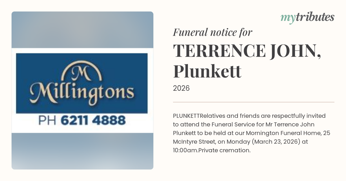 Relatives and friends are respectfully invited to attend the Funeral Service for Mr Terrence John Plunkett to be held at our Mornington Funeral Home, 25 McIntyre Street, on Monday (March 23, 2026) at 10:00am.
