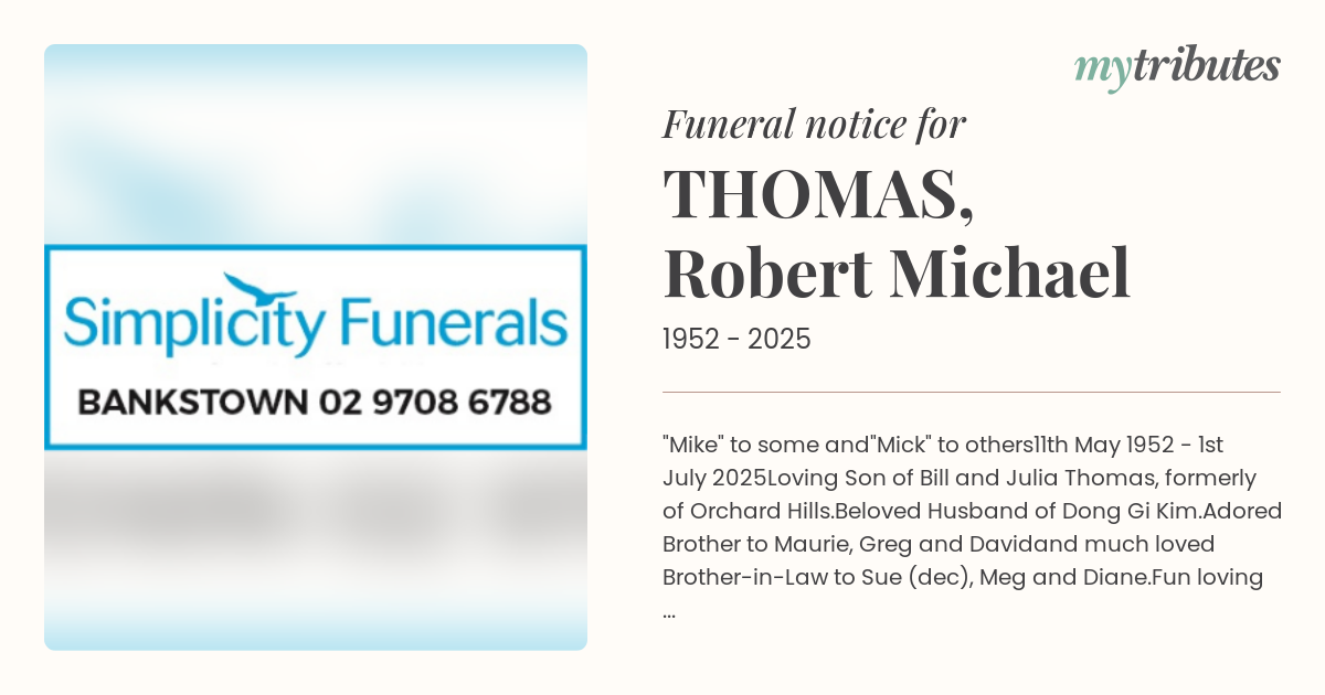 Family and Friends are warmly invited to attend the Funeral Service for Mike at 10.30am on Tuesday 15th July, at St Brendans Catholic Church, 49 Johnston Street, Annandale.