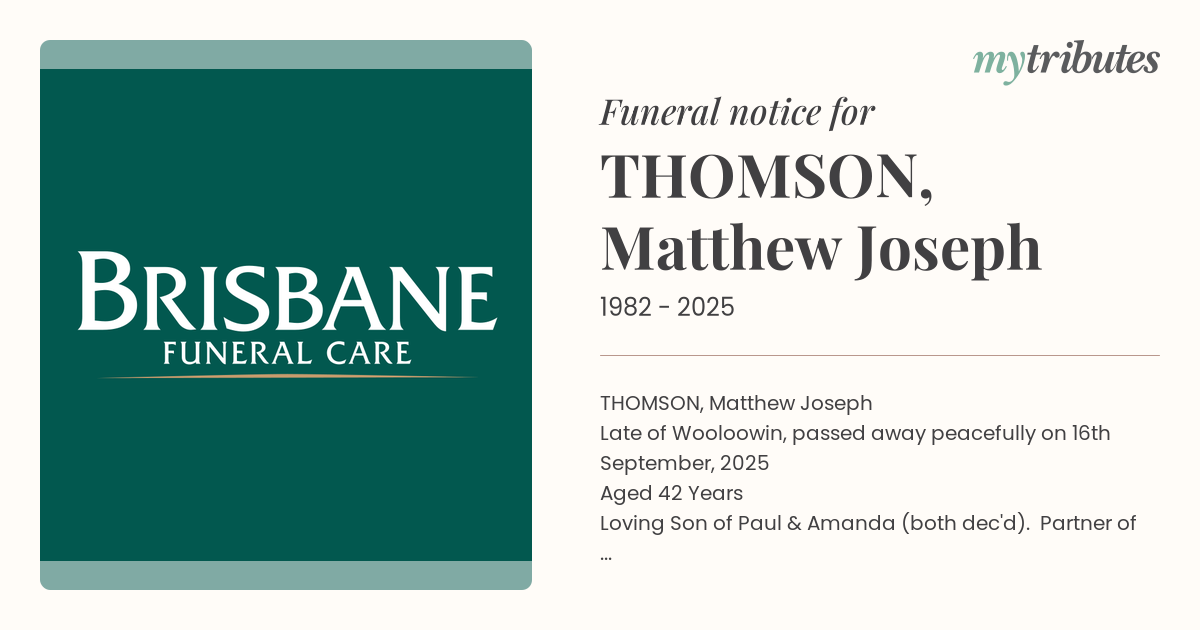 Family and Friends are invited to attend Celebration of Matt's Life to be held in the Garden Chapel, Albany Creek Memorial Park, 400 Albany Creek Road, Bridgeman Downs on Tuesday, 7th October, 2025 commencing at 1.30pm.