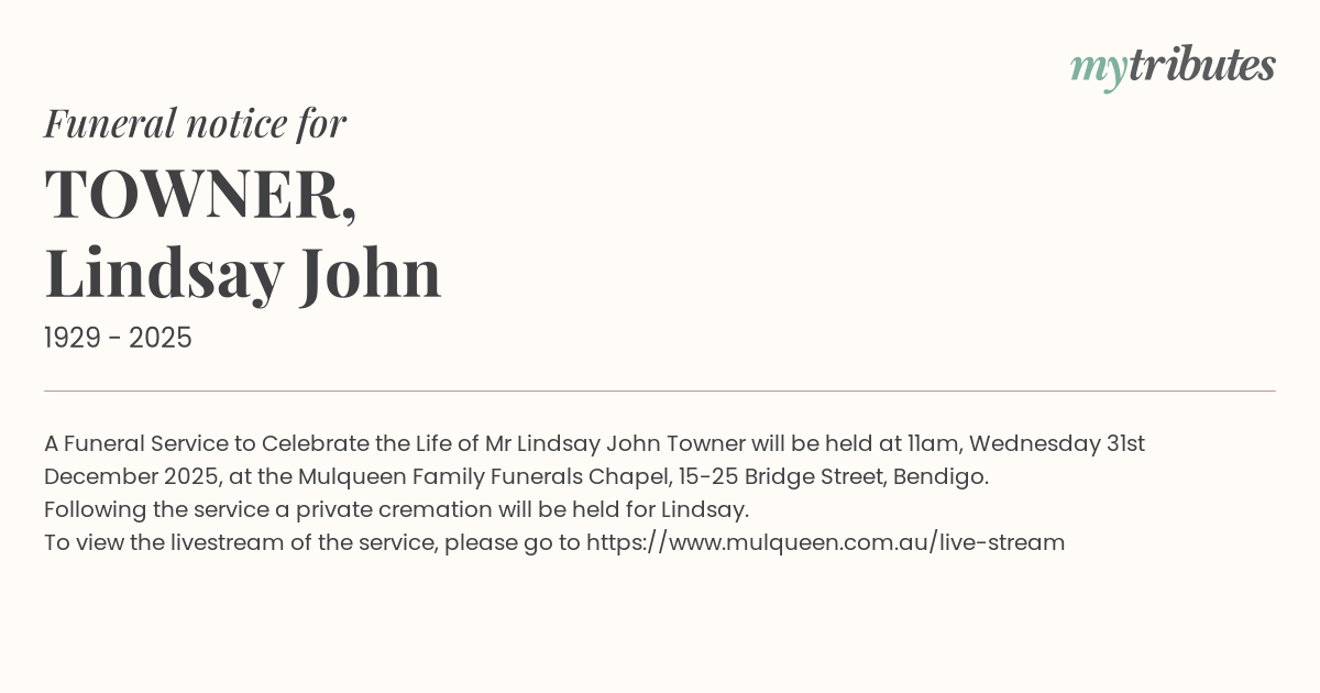 19°CA Funeral Service to Celebrate the Life of Mr Lindsay John Towner will be held at 11am, Wednesday 31st December 2025, at the Mulqueen Family Funerals Chapel, 15-25 Bridge Street, Bendigo.