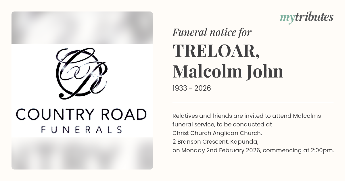 19°CRelatives and friends are invited to attend Malcolm’s funeral service, to be conducted at