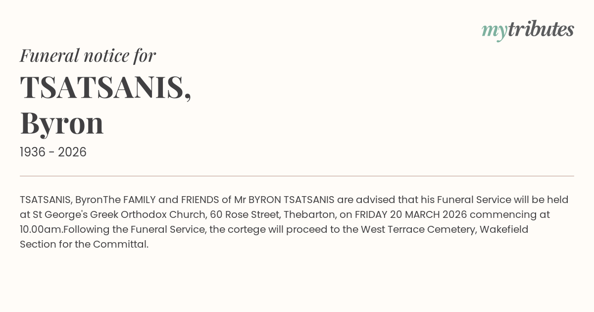 The FAMILY and FRIENDS of Mr BYRON TSATSANIS are advised that his Funeral Service will be held at