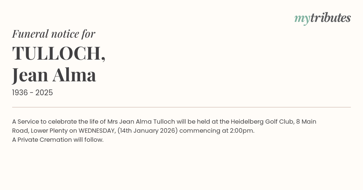 19°CA Service to celebrate the life of Mrs Jean Alma Tulloch will be held at the Heidelberg Golf Club, 8 Main Road, Lower Plenty on WEDNESDAY, (14th January 2026) commencing at 2:00pm.