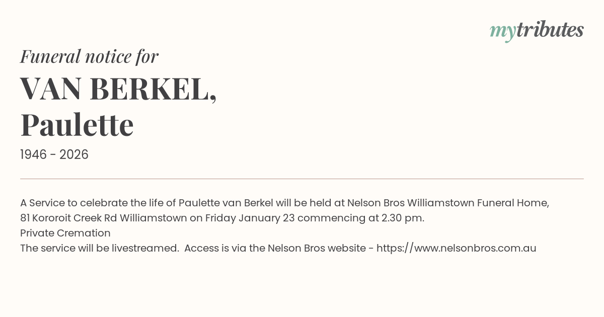 19°CA Service to celebrate the life of Paulette van Berkel will be held at Nelson Bros Williamstown Funeral Home, 81 Kororoit Creek Rd Williamstown on Friday January 23 commencing at 2.30 pm. Private Cremation The service will be livestreamed. Access is via the Nelson Bros website - https://www.nelsonbros.com.au