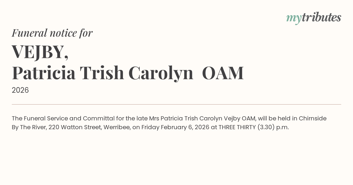 19°CThe Funeral Service and Committal for the late Mrs Patricia ‘Trish’ Carolyn Vejby OAM, will be held in Chirnside By The River, 220 Watton Street, Werribee, on Friday February 6, 2026 at THREE THIRTY (3.30) p.m.
