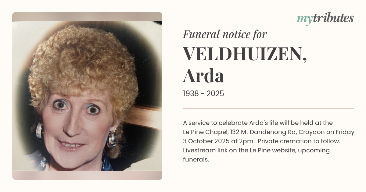 19°CA service to celebrate Arda's life will be held at the Le Pine Chapel, 132 Mt Dandenong Rd, Croydon on Friday 3 October 2025 at 2pm. Private cremation to follow. Livestream link on the Le Pine website, upcoming funerals.