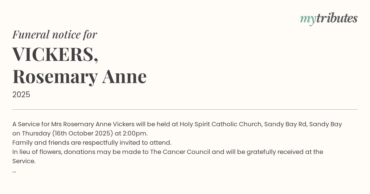 19°CA Service for Mrs Rosemary Anne Vickers will be held at Holy Spirit Catholic Church, Sandy Bay Rd, Sandy Bay on Thursday (16th October 2025) at 2:00pm.
