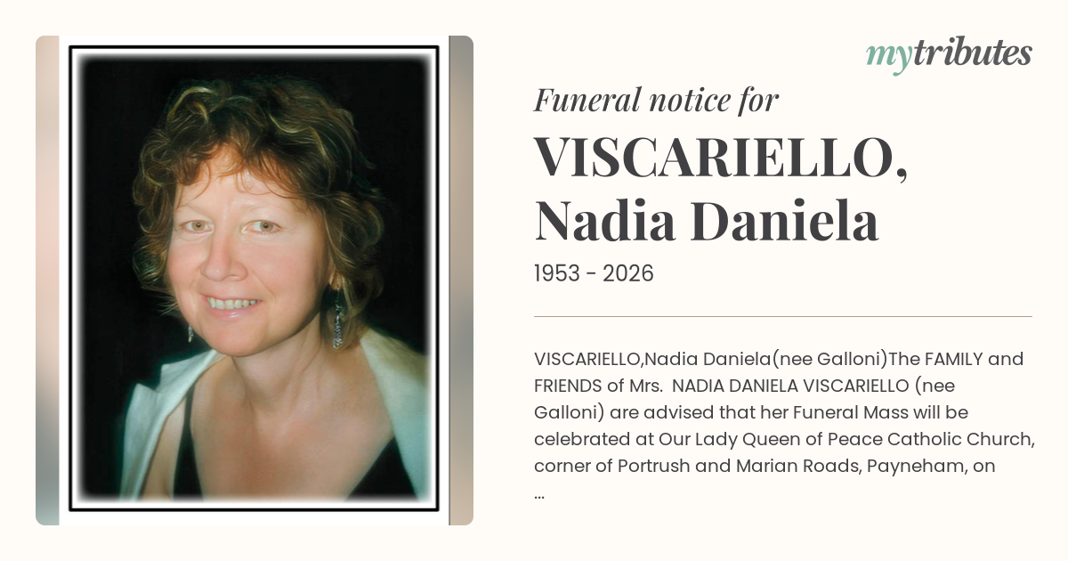 The FAMILY and FRIENDS of Mrs. NADIA DANIELA VISCARIELLO (nee Galloni) are advised that her Funeral Mass will be celebrated at Our Lady Queen of Peace Catholic Church, corner of Portrush and Marian Roads, Payneham, on TUESDAY, 31 March 2026, commencing at 10.00am.