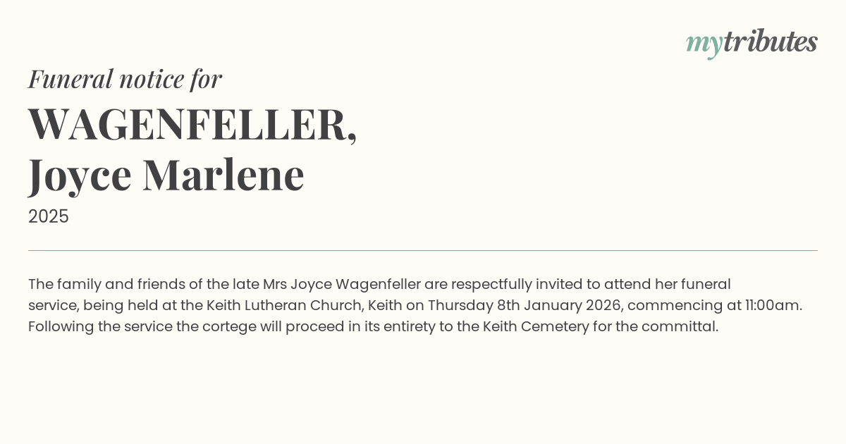19°CThe family and friends of the late Mrs Joyce Wagenfeller are respectfully invited to attend her funeral service, being held at the Keith Lutheran Church, Keith on Thursday 8th January 2026, commencing at 11:00am.