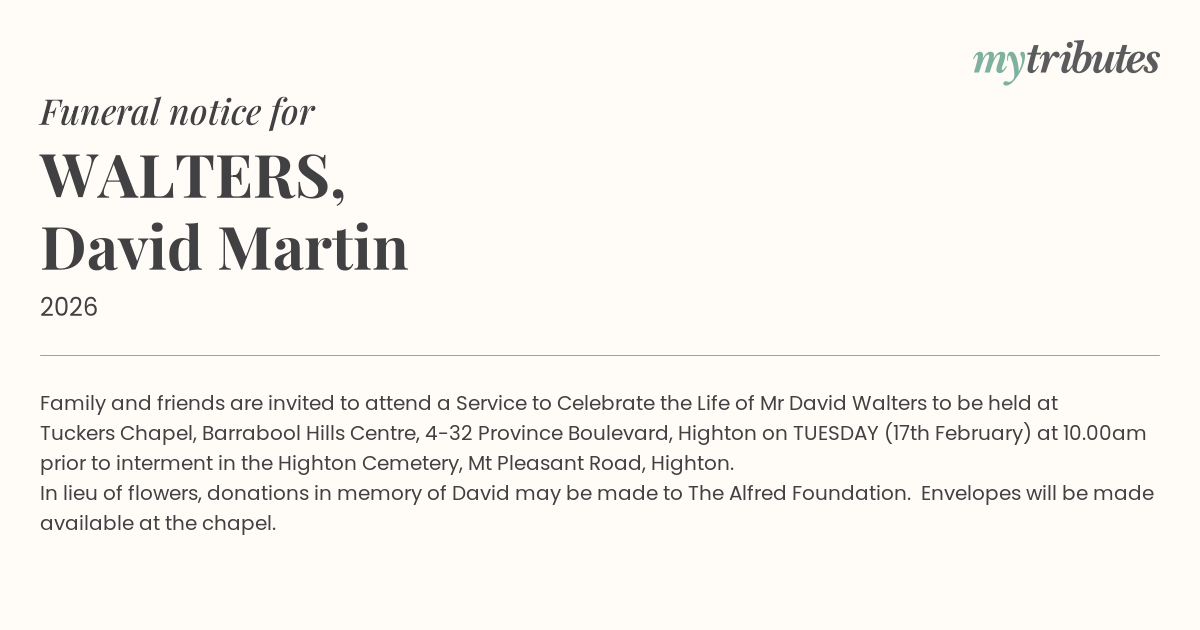 19°CFamily and friends are invited to attend a Service to Celebrate the Life of Mr David Walters to be held at Tuckers Chapel, Barrabool Hills Centre, 4-32 Province Boulevard, Highton on TUESDAY (17th February) at 10.00am prior to interment in the Highton Cemetery, Mt Pleasant Road, Highton.