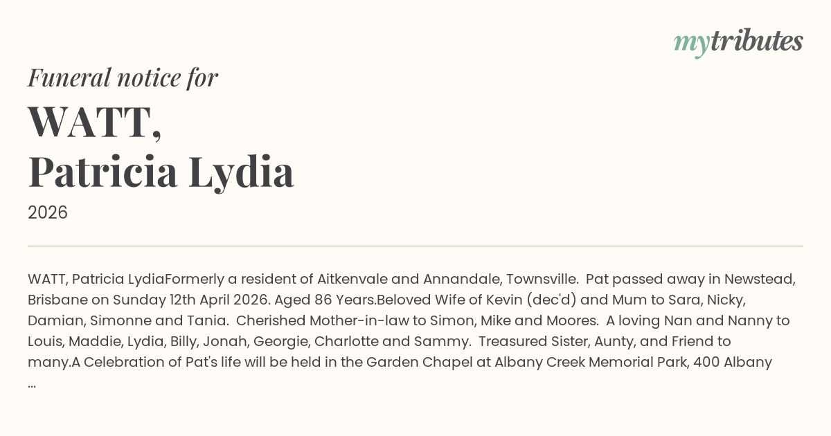 A Celebration of Pat's life will be held in the Garden Chapel at Albany Creek Memorial Park, 400 Albany Creek Road, Bridgeman Downs, on Friday 17th April 2026 at 9:00am. The service will be livestreamed.