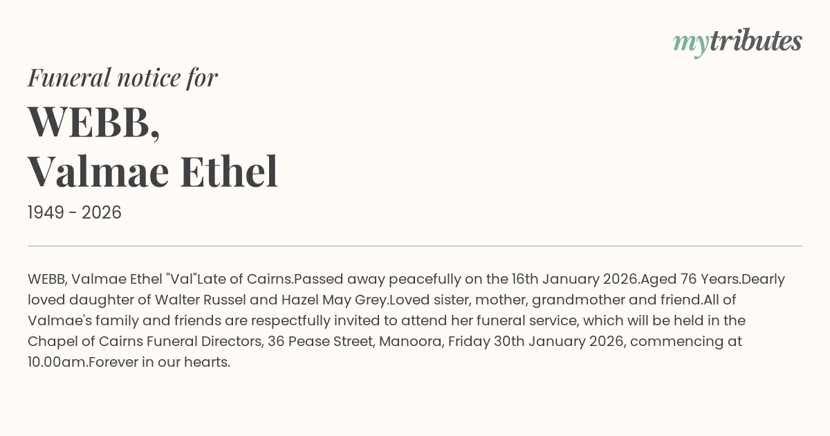 All of Valmae's family and friends are respectfully invited to attend her funeral service, which will be held in the Chapel of Cairns Funeral Directors, 36 Pease Street, Manoora, Friday 30th January 2026, commencing at 10.00am.