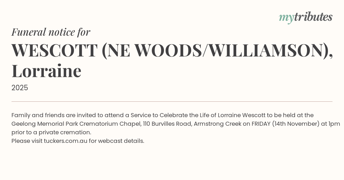 19°CFamily and friends are invited to attend a Service to Celebrate the Life of Lorraine Wescott to be held at the Geelong Memorial Park Crematorium Chapel, 110 Burvilles Road, Armstrong Creek on FRIDAY (14th November) at 1pm prior to a private cremation.