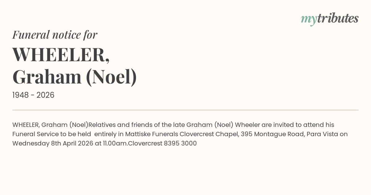 Relatives and friends of the late Graham (Noel) Wheeler are invited to attend his Funeral Service to be held entirely in Mattiske Funerals Clovercrest Chapel,