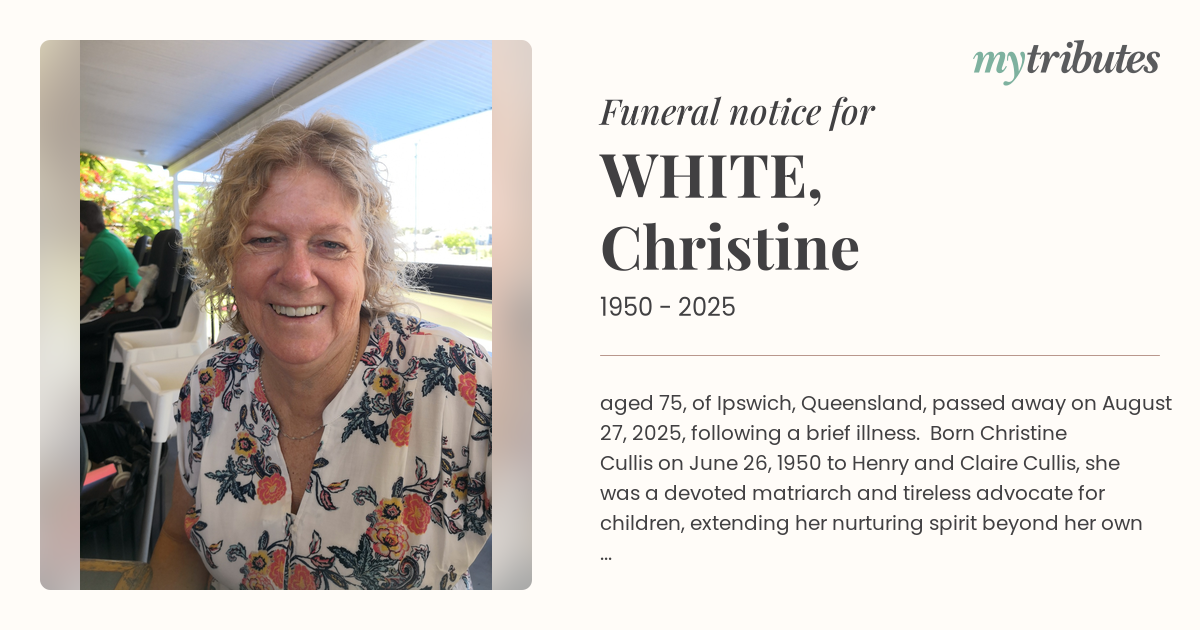 19°Caged 75, of Ipswich, Queensland, passed away on August 27, 2025, following a brief illness. Born Christine Cullis on June 26, 1950 to Henry and Claire Cullis, she was a devoted matriarch and tireless advocate for children, extending her nurturing spirit beyond her own family to support vulnerable youth in her community through volunteering at local schools and centers.A woman of unyielding strength, Christine instilled resilience in her six children, teaching them to speak out against injustice and champion the downtrodden, misunderstood, and unhappy. Her kindness was boundless, though it often led her to fiercely protect those she loved, sometimes at her own expense. Christine is survived by her six children, ten grandchildren, and four great-grandchildren, who carry forward her legacy of compassion and courage. Christine's burial will be held at Hemmant Cemetery on September 25, 2025, at 2:00 PM.
