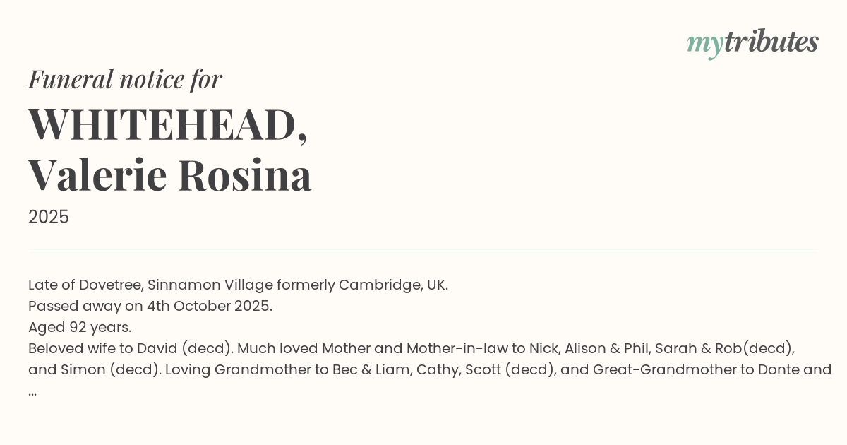 Family and Friends are warmly invited to attend a funeral service for Valerie at 3:30pm on Tuesday, 14th October 2025 at Centenary Memorial Gardens, 353 Wacol Station Road, Sumner.