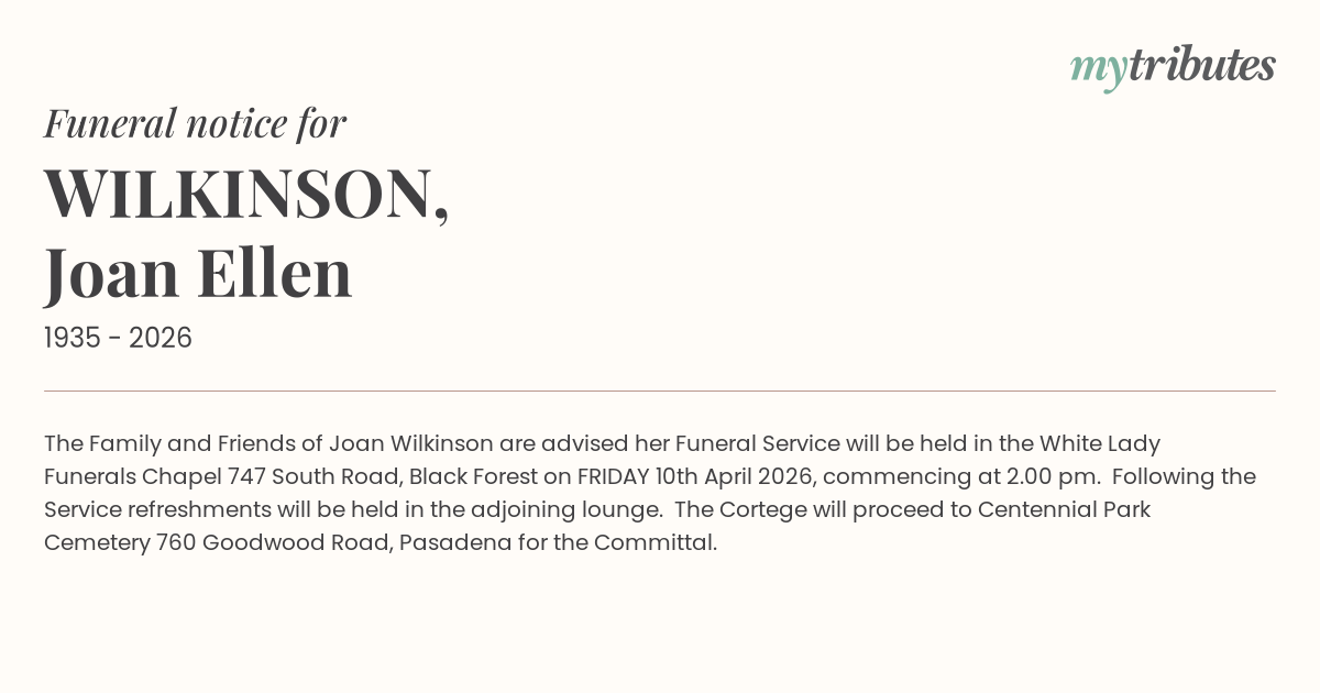 19°CThe Family and Friends of Joan Wilkinson are advised her Funeral Service will be held in the White Lady Funerals Chapel 747 South Road, Black Forest on FRIDAY 10th April 2026, commencing at 2.00 pm.