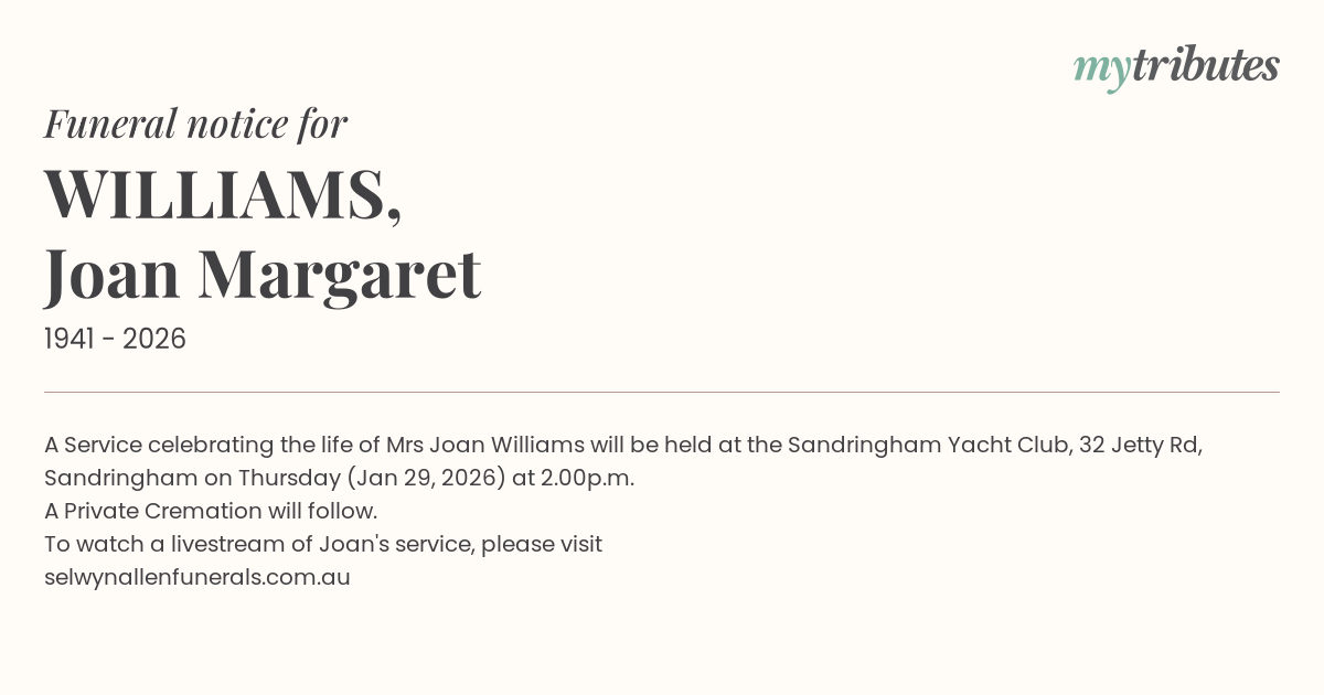 19°CA Service celebrating the life of Mrs Joan Williams will be held at the Sandringham Yacht Club, 32 Jetty Rd, Sandringham on Thursday (Jan 29, 2026) at 2.00p.m.