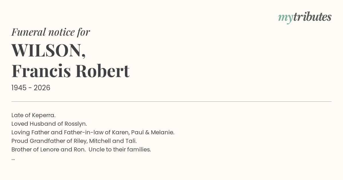 Family and Friends are invited to attend a Celebration of Frank's life to be held at Albany Creek Memorial Park Garden Chapel on Monday the 23rd February, 2026 commencing at 10:30am.