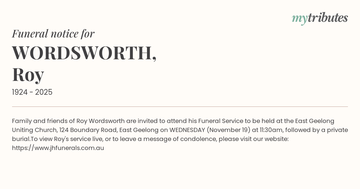 19°CFamily and friends of Roy Wordsworth are invited to attend his Funeral Service to be held at the East Geelong Uniting Church, 124 Boundary Road, East Geelong on WEDNESDAY (November 19) at 11:30am, followed by a private burial.